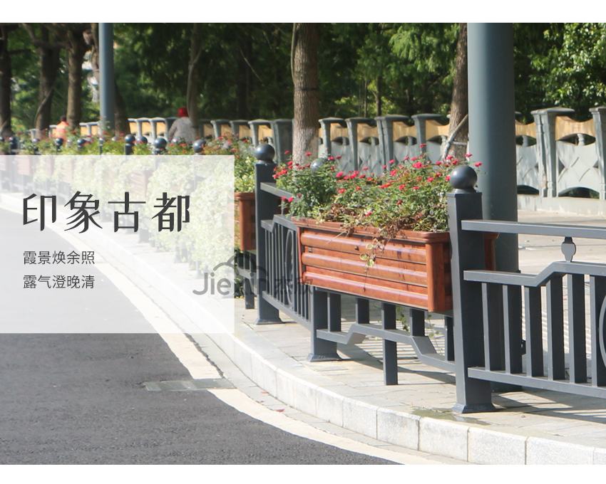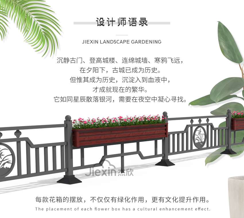 這款花箱護(hù)欄在設(shè)計(jì)元素中添加了地方特色,古老的寶塔凸顯出城市的文化底蘊(yùn)。
