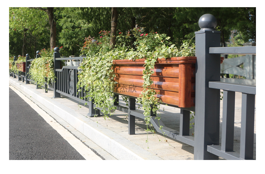 紅木色花箱護(hù)欄在道路中很常見。