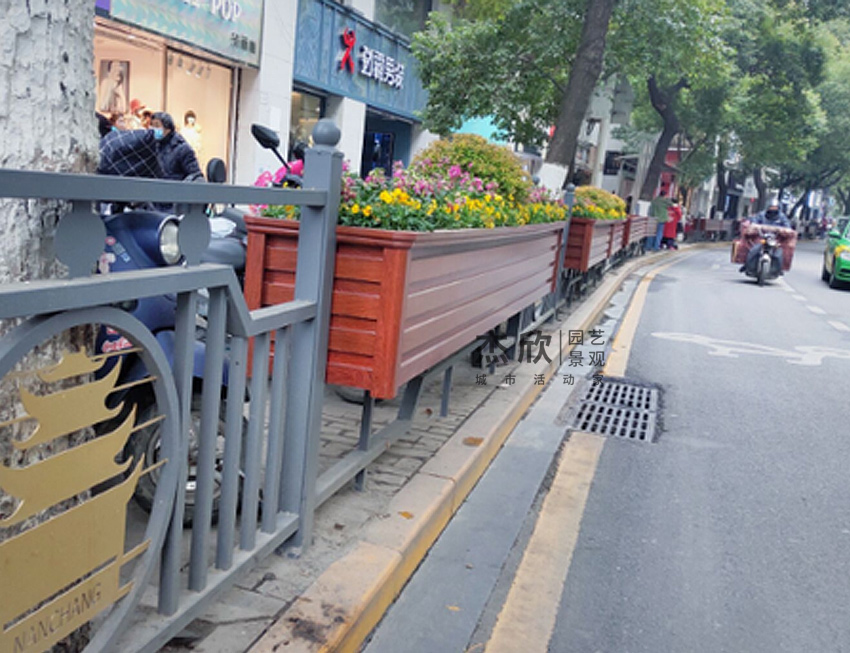 2019年,南昌市啟動(dòng)了大量的景觀提升工程,一批“綠改彩”項(xiàng)目在全市鋪開(kāi),漫行于中山路上,幾十萬(wàn)時(shí)令草花在防腐木花箱和懸掛組合式花箱中盡情搖曳,風(fēng)采婀娜,這條商業(yè)街頓時(shí)五彩斑斕,中山路進(jìn)入了彩色時(shí)代??蛇@些花箱起到景觀提升效果的同時(shí),也有些弊端,比如:懸掛組合式花箱超出護(hù)欄,給行人車輛帶來(lái)安全隱患;花箱本身的種植空間非常有限,不易固定在護(hù)欄上;防腐木花箱體量大占據(jù)了人行道空間,給行人帶來(lái)不便。
