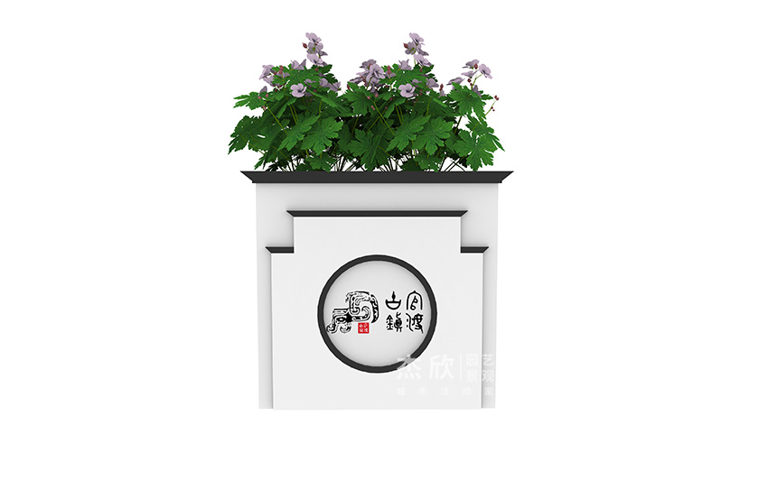 這款花箱也運用了大家熟悉的元素——馬頭墻。但是設(shè)計師又精心設(shè)計過,使得花箱更加具有輕盈的美感。另外還加入了漏窗、書法藝術(shù),平添了文化氣息。