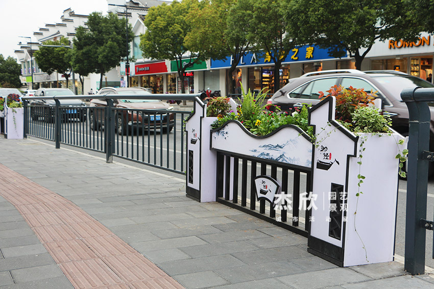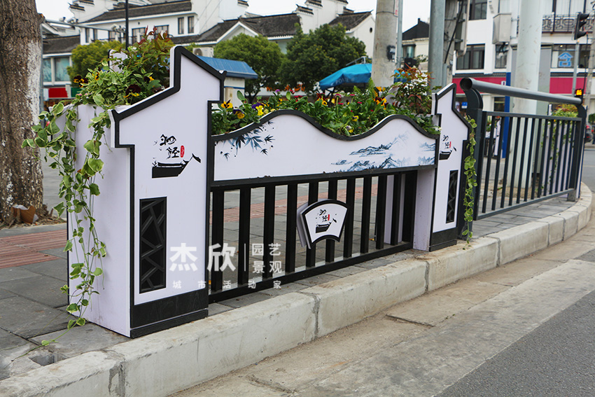 泗涇古鎮(zhèn)也保留了江南傳統(tǒng)文化的韻味,在道路花箱的選擇上,用水墨展現(xiàn)原生態(tài)的江南風景。簡化的馬頭墻、飛檐、窗格,都一一呈現(xiàn)出時代的美感。黑白看似單調(diào),但其中蘊藏著無限的生機,從無到有,從簡單到豐富,都在意境中得到滿足。