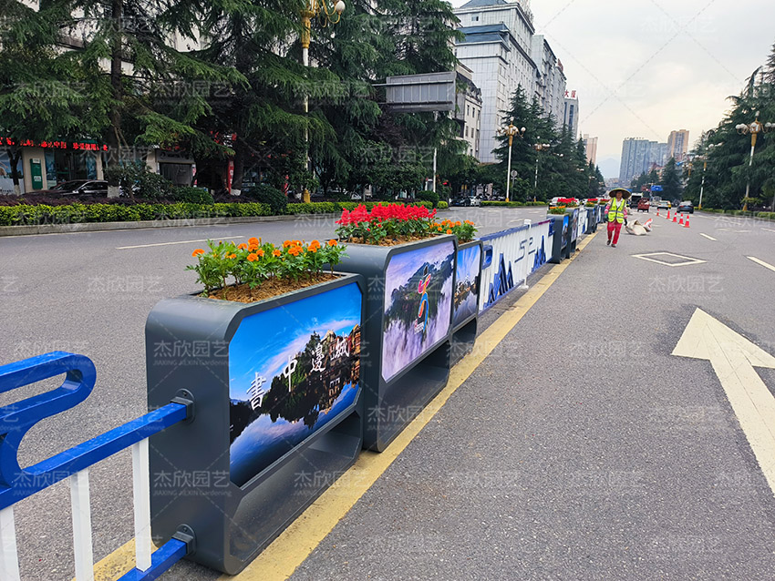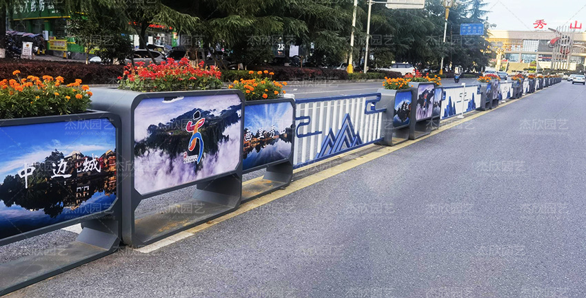 道路花箱護(hù)欄,既提供了百花的承載體,也匹配了城市道路景觀的要求。