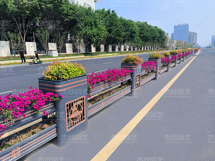 在實(shí)際中,道路花箱護(hù)欄滿足了以下的需求:1.尺寸根據(jù)場(chǎng)地設(shè)計(jì)、靈活運(yùn)用。2.在立面上,展示城市風(fēng)情與特點(diǎn)。3.在款式上,造型多樣,選擇范圍廣。