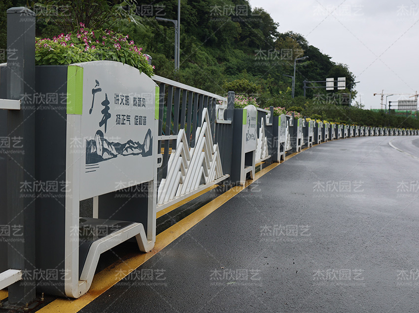 景觀護欄以山水為主元素,簡潔詩意、如臨畫境,輕盈的山水白云間,呈現(xiàn)出自然生態(tài)的飄逸感。花箱上字體與圖畫,讓人一秒走進了廣豐的天地。