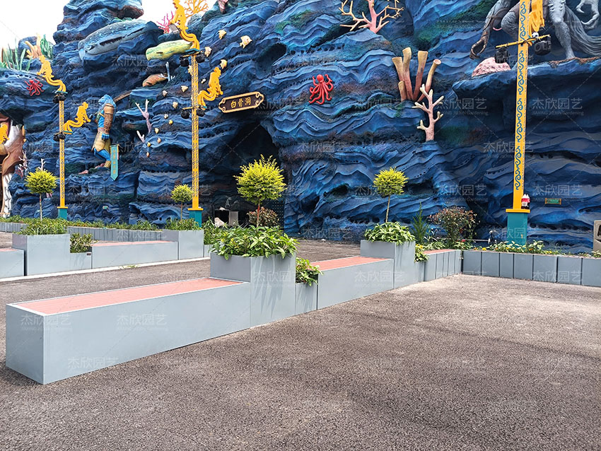 景觀小品集花箱與坐凳于一體,營造綠色生態(tài)效果,塑造休閑自然的氛圍。