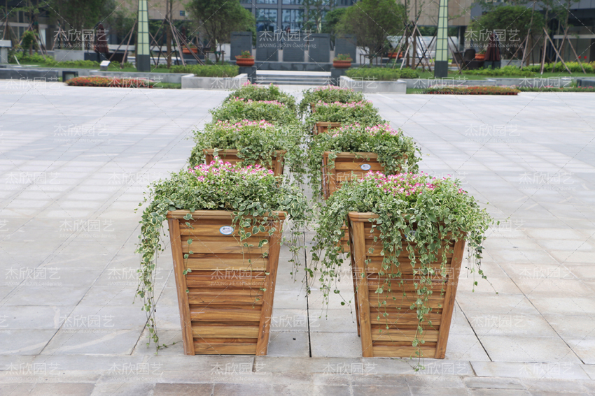 景觀效果:黃檀木色花箱,梯形的外觀,排列組合,搭配綠植,起到了景觀的裝飾效果。