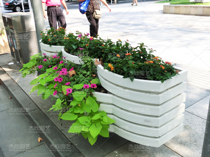 藝術(shù)花箱能夠展示出街道的美景?;⌒位ㄏ溆泻軓?qiáng)的造型感,白色的花箱外觀,搭配綠植和花卉都很好看!還能有垂墜的視覺感!給行人帶來如沐春風(fēng)的感覺。